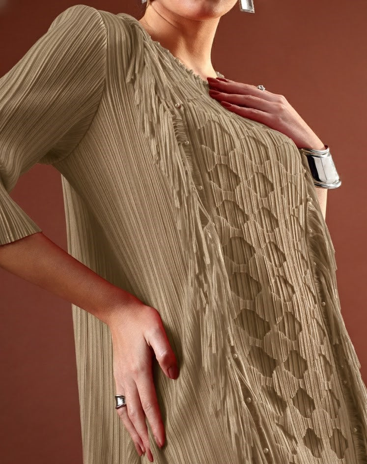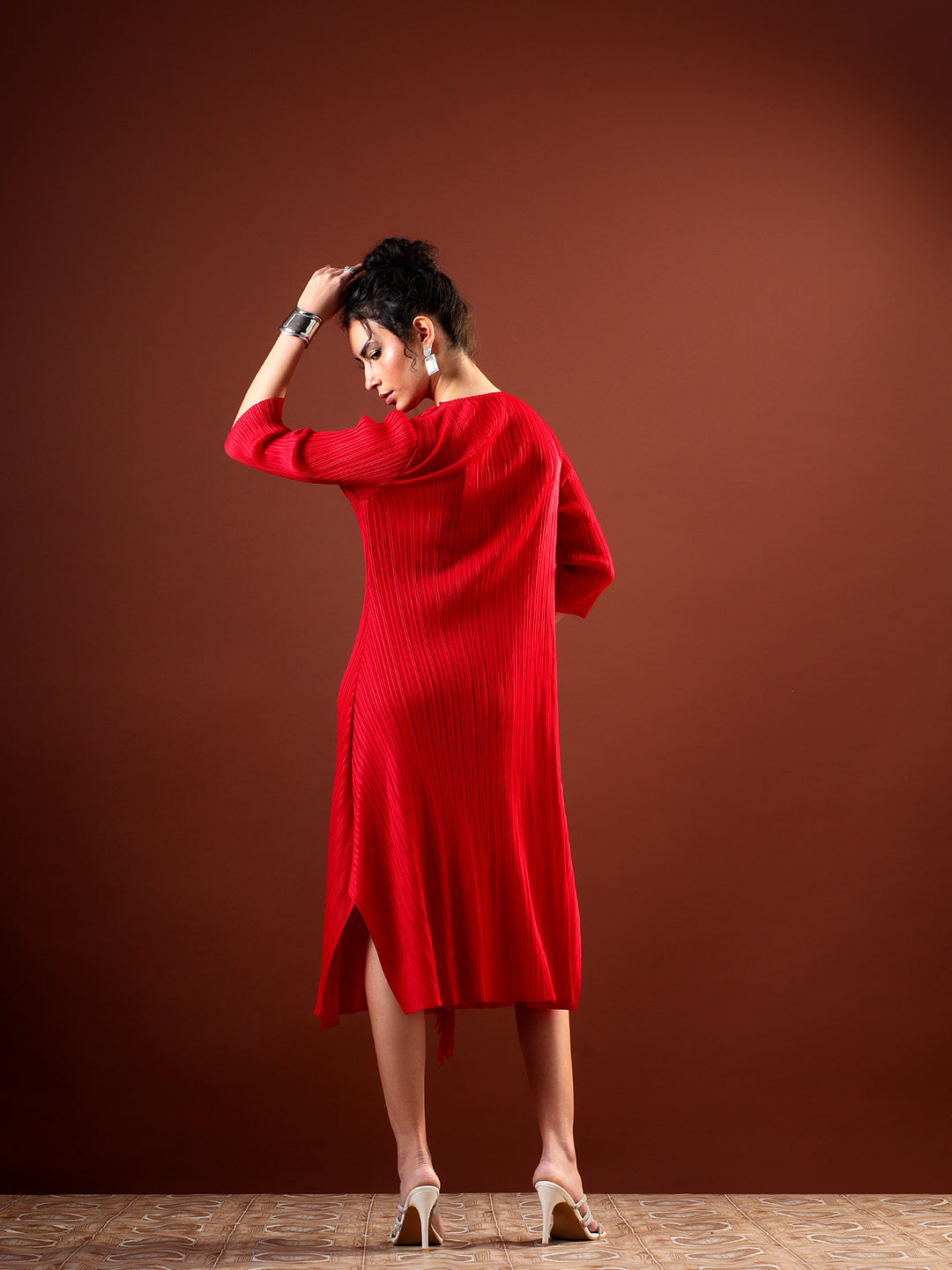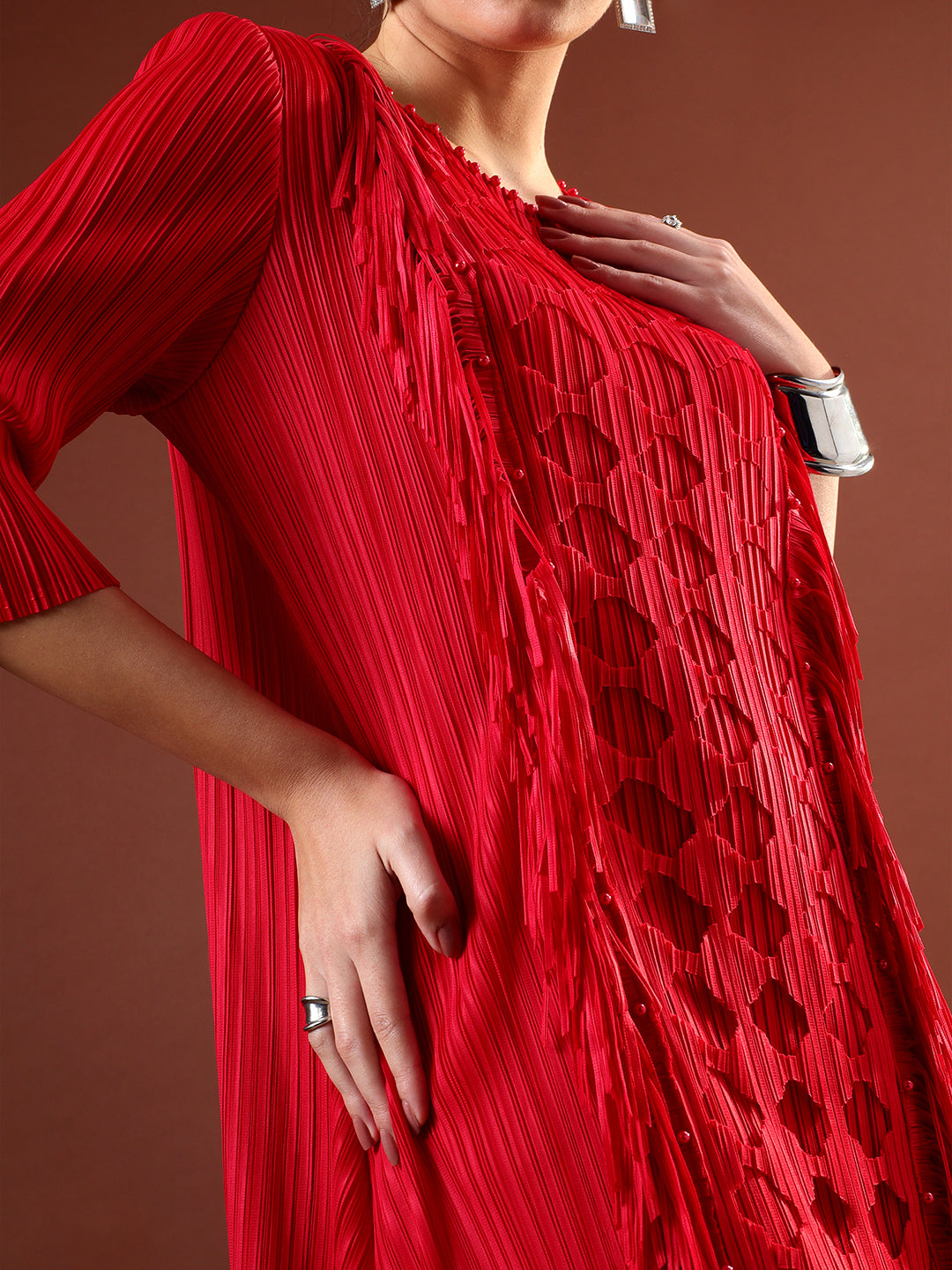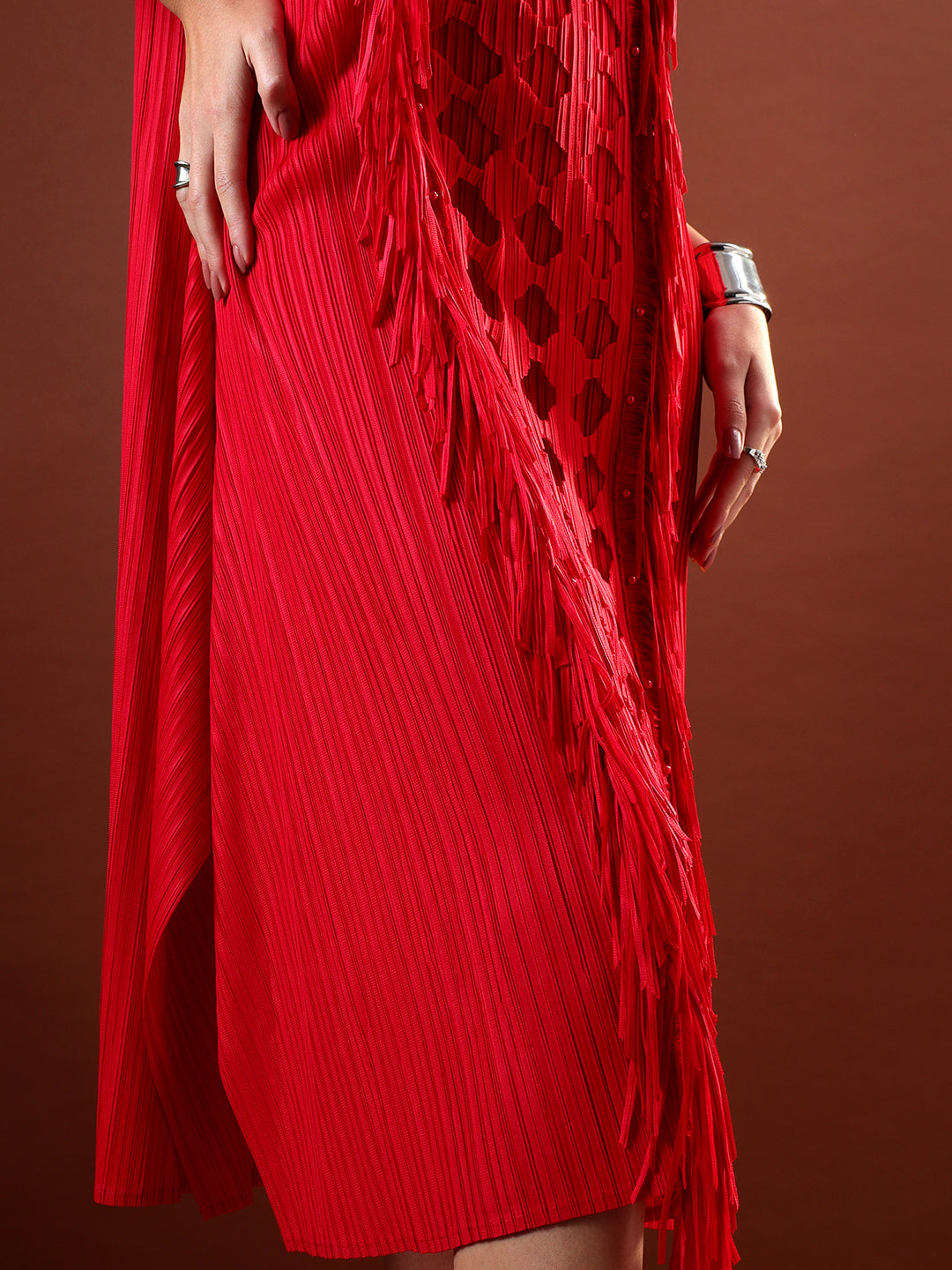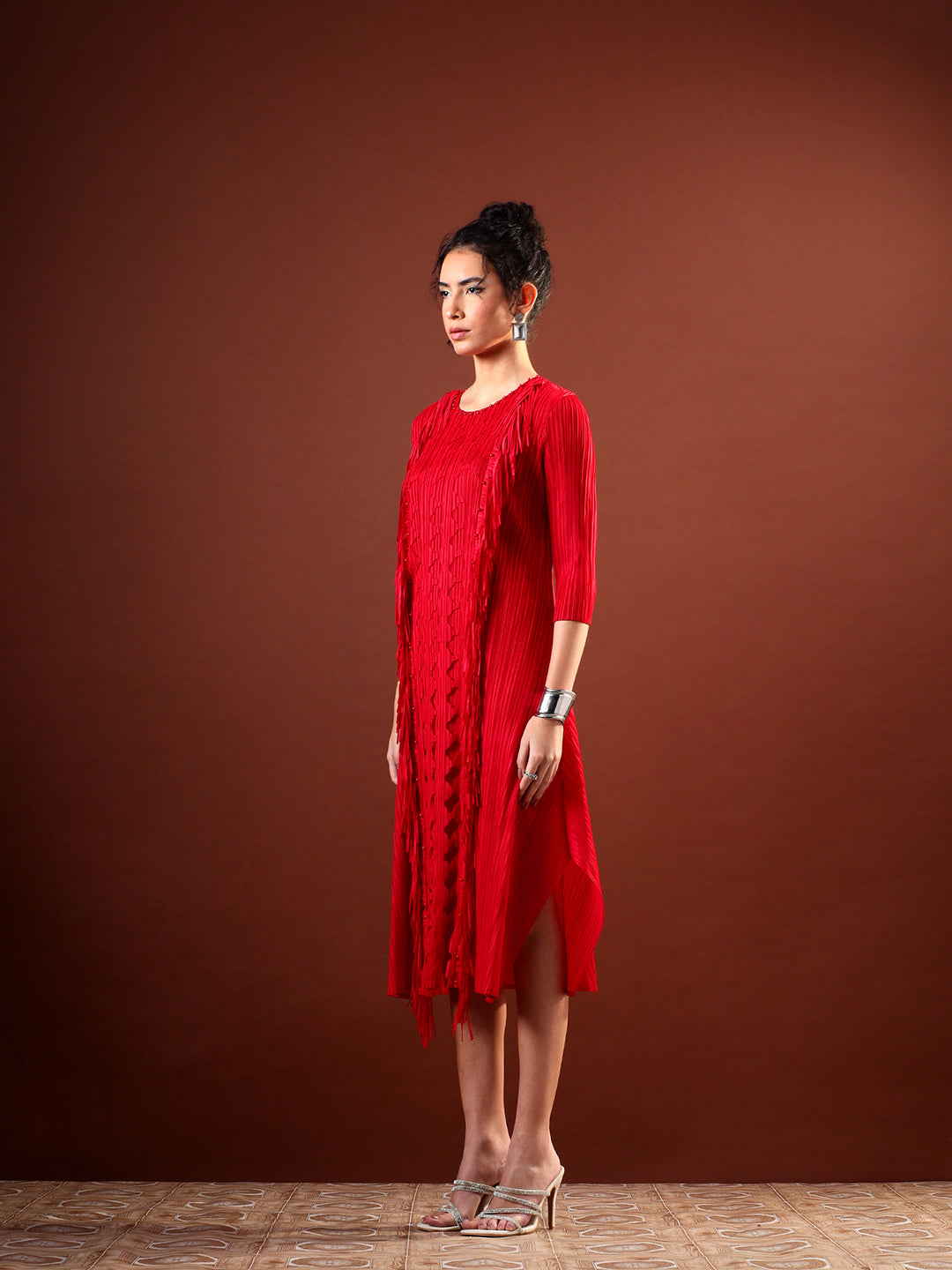 A statement in texture and detail, this pleated midi dress is designed to move with effortless grace. Crafted in a warm red hue, it features a striking cutwork panel down the front, finished with delicate fringe accents that add fluid movement and depth. The softly pleated fabric enhances the silhouette, while the three-quarter sleeves and clean neckline keep the look refined and balanced. Perfect for festive occasions, evening gatherings, or elevated day events, this dress blends modern design with timeless elegance.