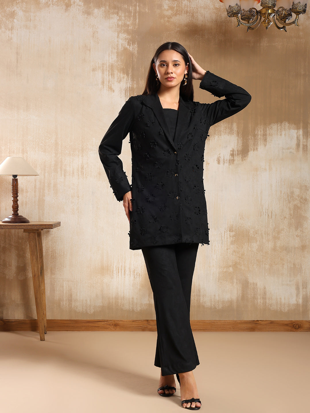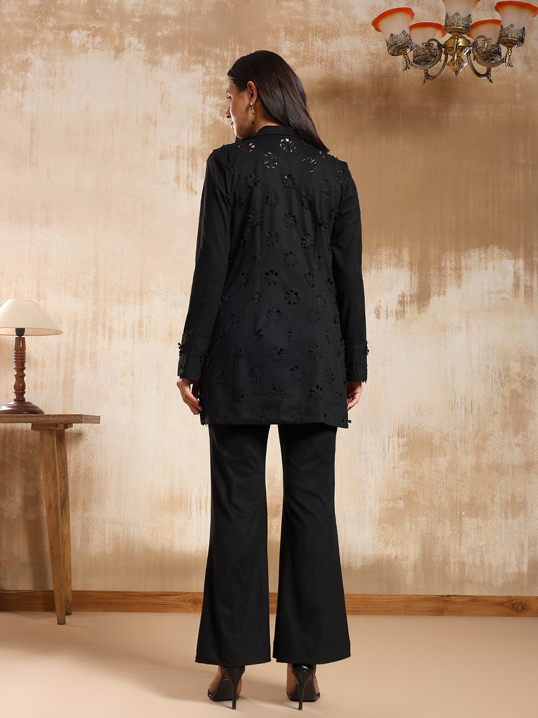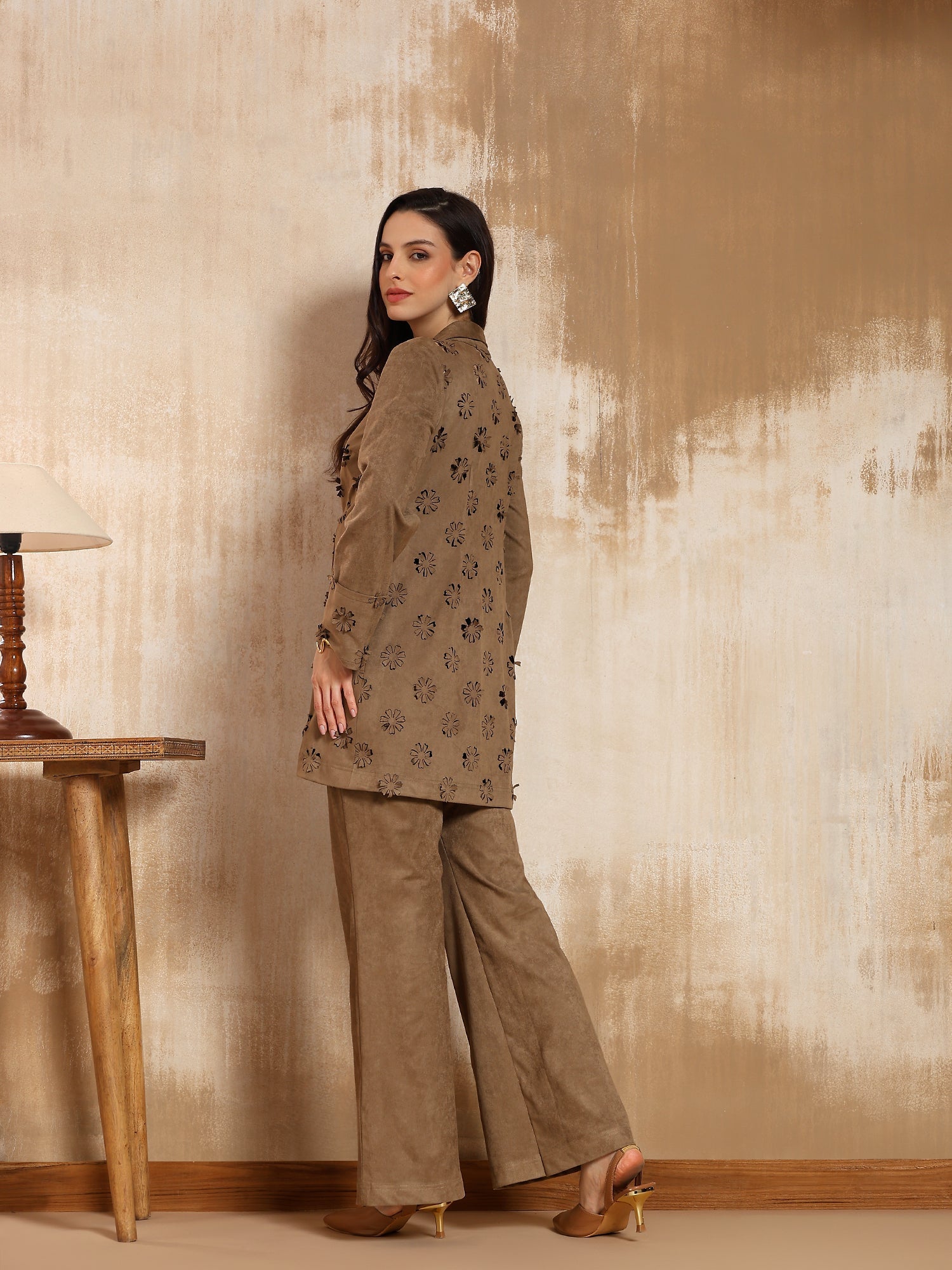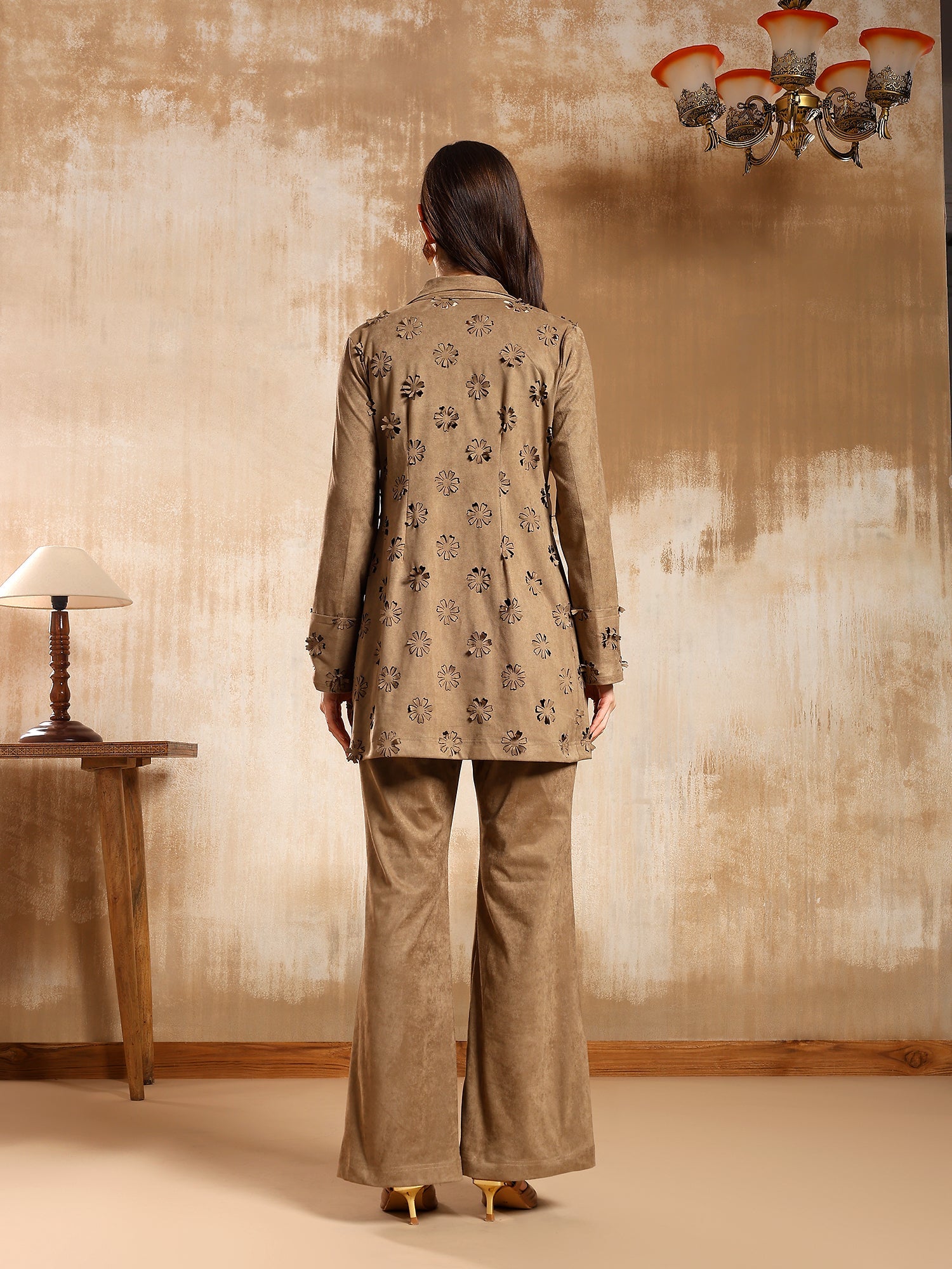 The Camila Suede Co-ord Set brings together texture and refinement in perfect balance. Crafted in soft, warm beige suede, it features delicate laser-cut floral motifs along the shirt and cuffs. The relaxed-fit pants and fluid shirt silhouette make it both comfortable and chic- ideal for winter brunches, travel days, or casual evening plans.