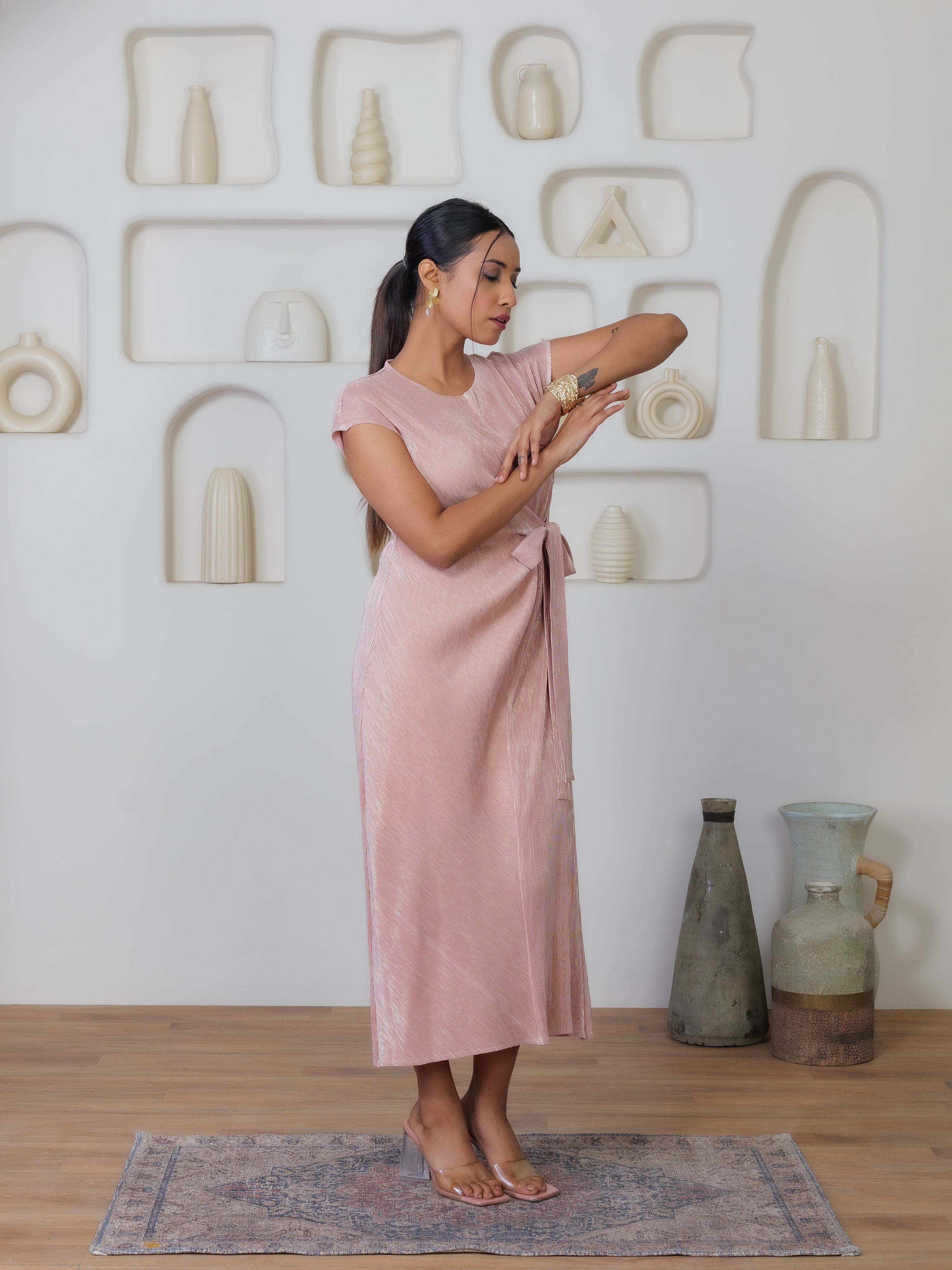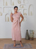 The Enigma Dress boasts a sleek, midi-length cut, with a luxurious pleated fabric that envelops the body in a cascade of refined texture. The fabric's subtle metallic finish lends a touch of glamour, ensuring that you'll stand out with an understated shimmer at any event. A tasteful tie waist accentuates your silhouette, offering both style and a customisable fit.