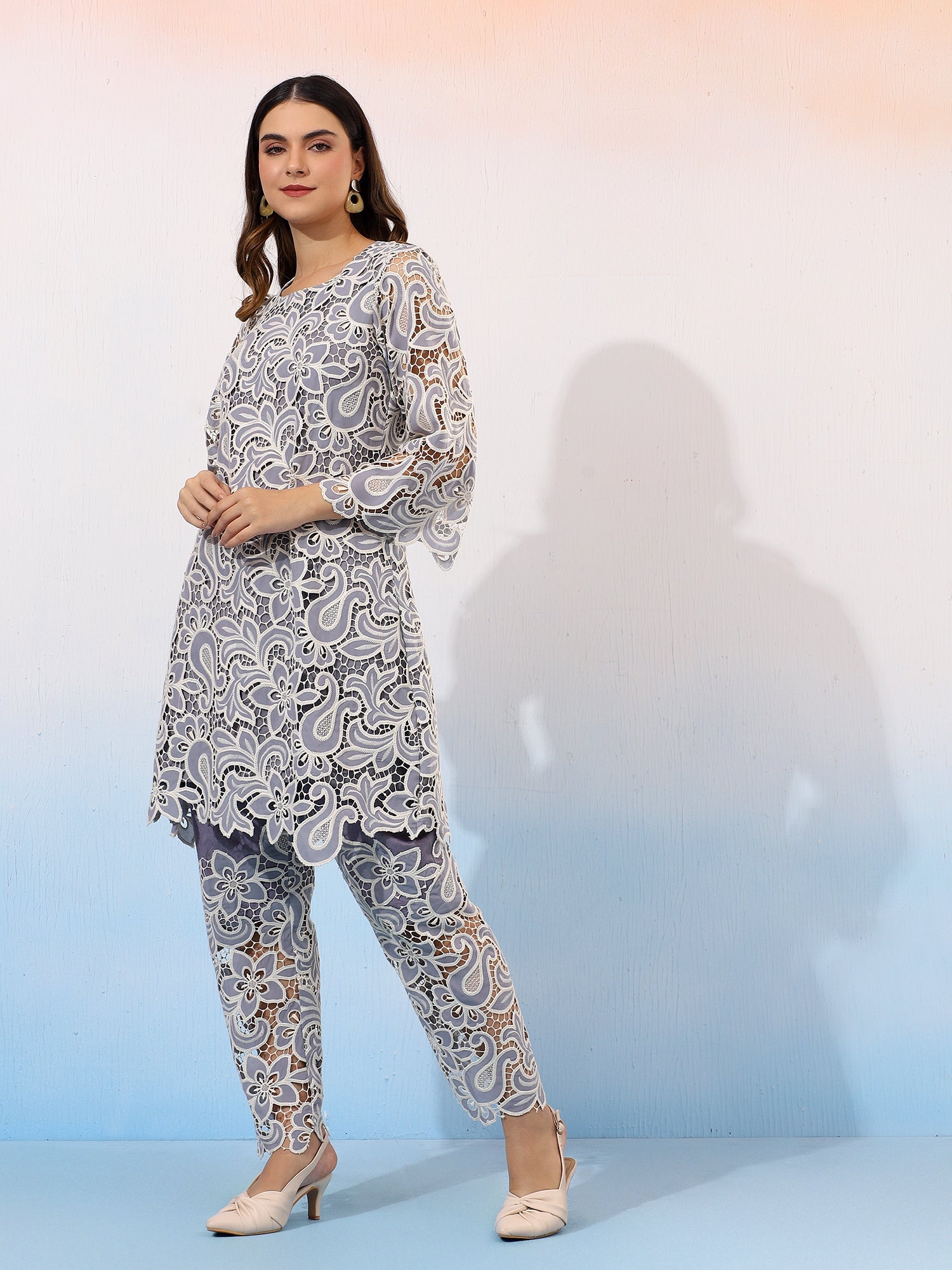 Step into the season’s trends with our cutwork Coord Set, designed to offer a perfect blend of style and sophistication. This intricately detailed set, crafted from delicate lace fabric, brings a touch of elegance to your wardrobe, making it ideal for any occasion.