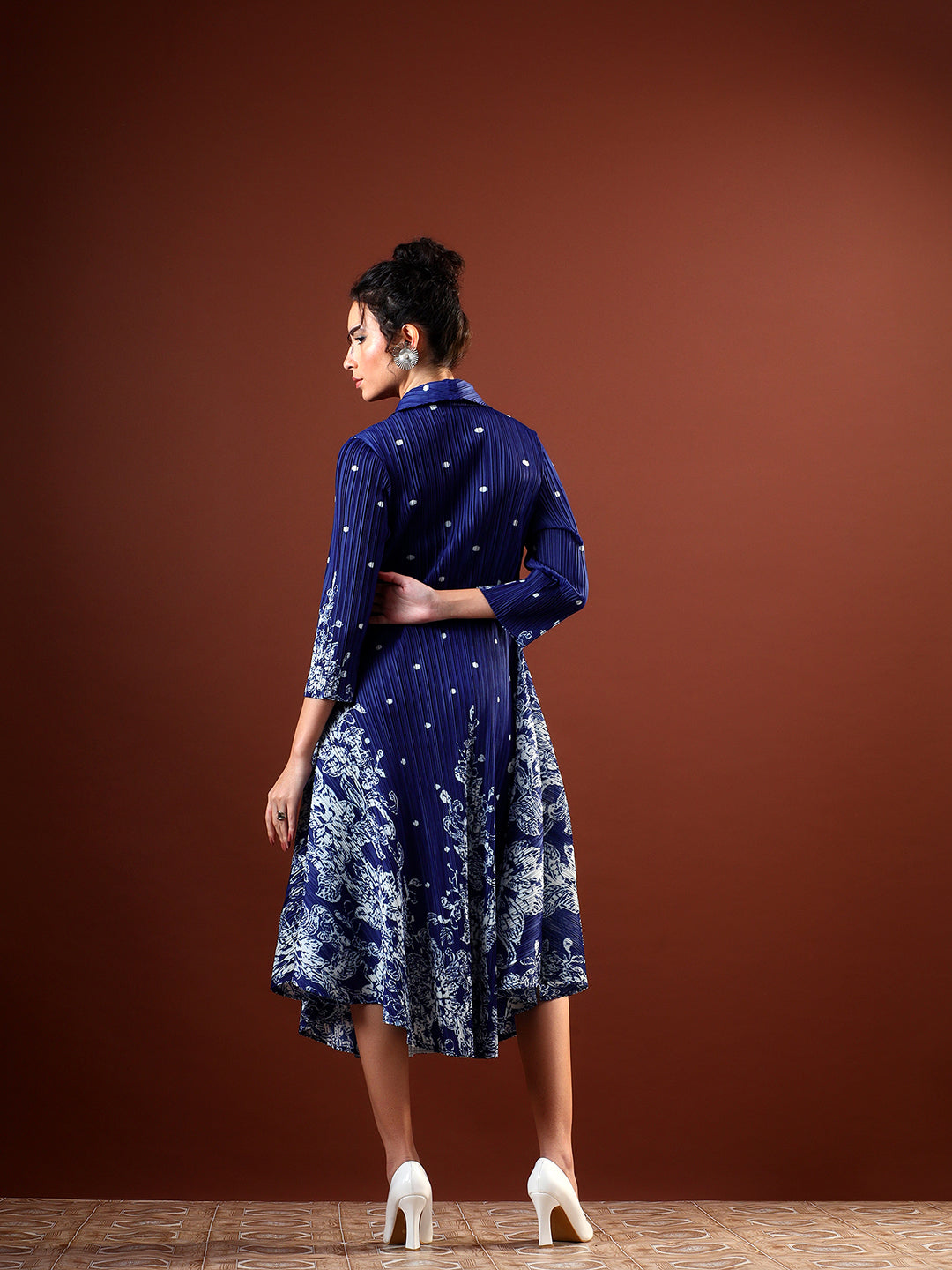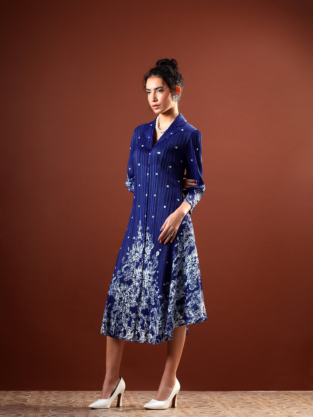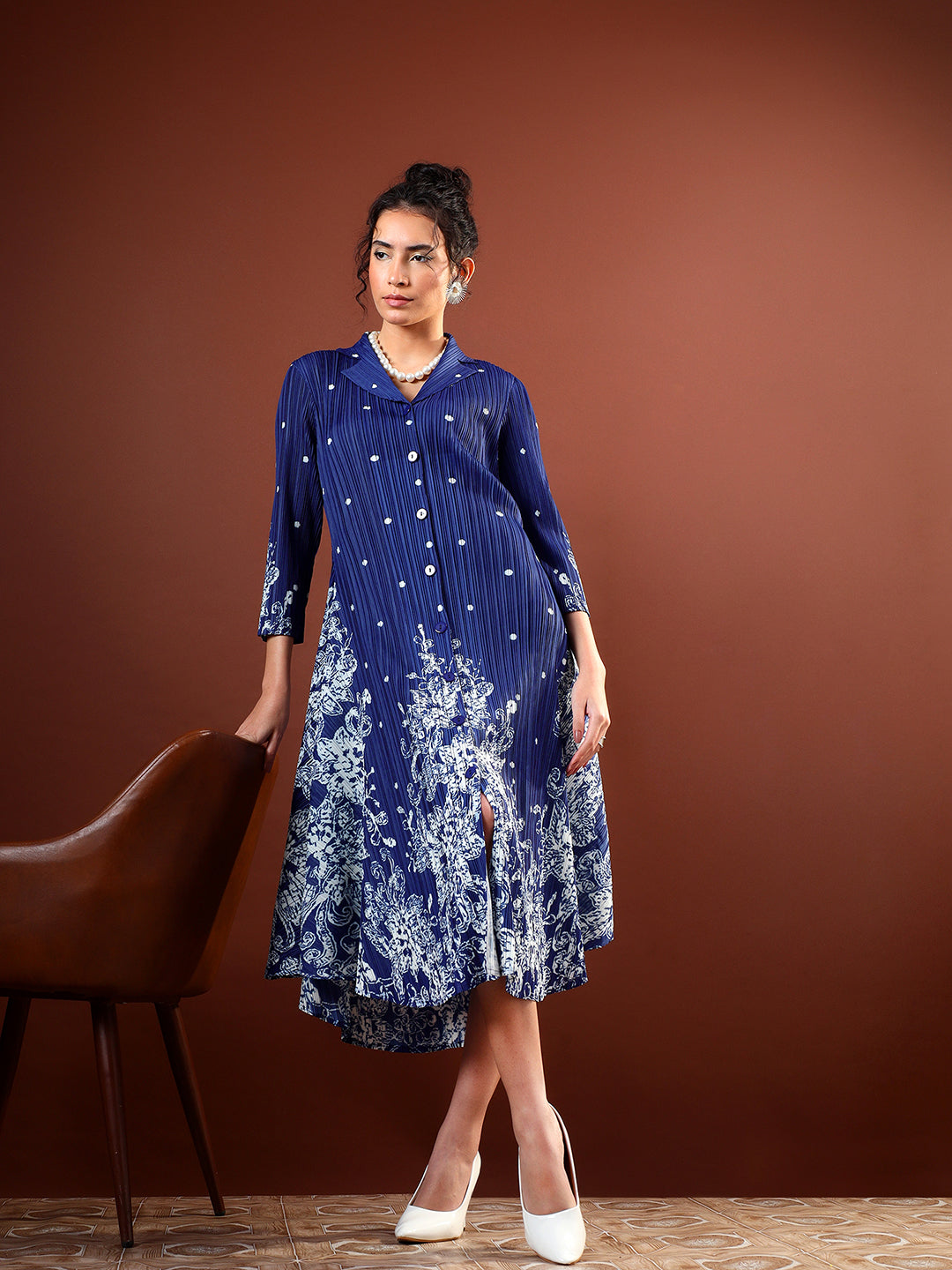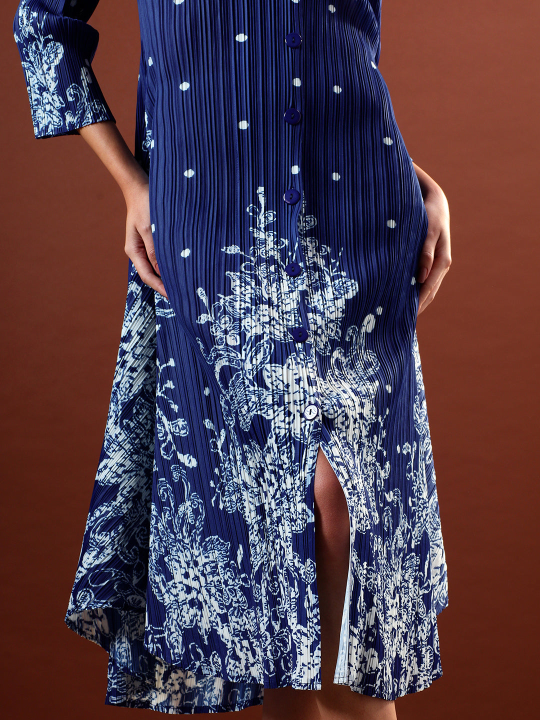 A refined blend of structure and softness, this indigo midi dress is crafted in finely pleated fabric that moves with effortless grace. Featuring a tailored shirt-style collar and button-down front, the silhouette is elevated with delicate dot detailing and an artistic floral print along the hem. Designed to flatter while remaining comfortable, this piece transitions seamlessly from daytime elegance to understated evening charm — a timeless addition to a modern wardrobe.