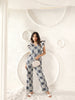 Make a striking style statement with the Nautica Ruffle Coord, designed in a captivating navy and ivory tile-inspired print. The top features playful ruffle sleeves and a flattering V-neckline, paired with straight-cut pants for a sleek, coordinated look. Perfect for brunches, resort getaways, or chic day events, this set effortlessly blends comfort with standout design.