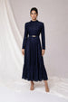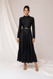 A timeless velvet maxi dress crafted with elegant vertical pleats that elongate the silhouette. Featuring a soft ruffled neckline, full sleeves, and a flowy tiered hem, it combines sophistication with effortless movement. The gold-buckle waist belt cinches the look perfectly, adding a refined touch of glamour. Ideal for evening events, winter gatherings, or any occasion where classic elegance is key.