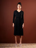 Elegant and timeless, this black embellished midi dress is designed to flatter with subtle detail and graceful movement. Crafted in a softly textured fabric, it features delicate tonal embellishments arranged along the bodice and skirt, adding a refined hint of sparkle. The V-neckline and long sleeves create a sleek, balanced silhouette, while the adjustable waist tie defines the shape effortlessly. Falling into a gentle A-line hem, this dress transitions seamlessly from evening gatherings to intimate celebrations, offering understated sophistication with every wear.
