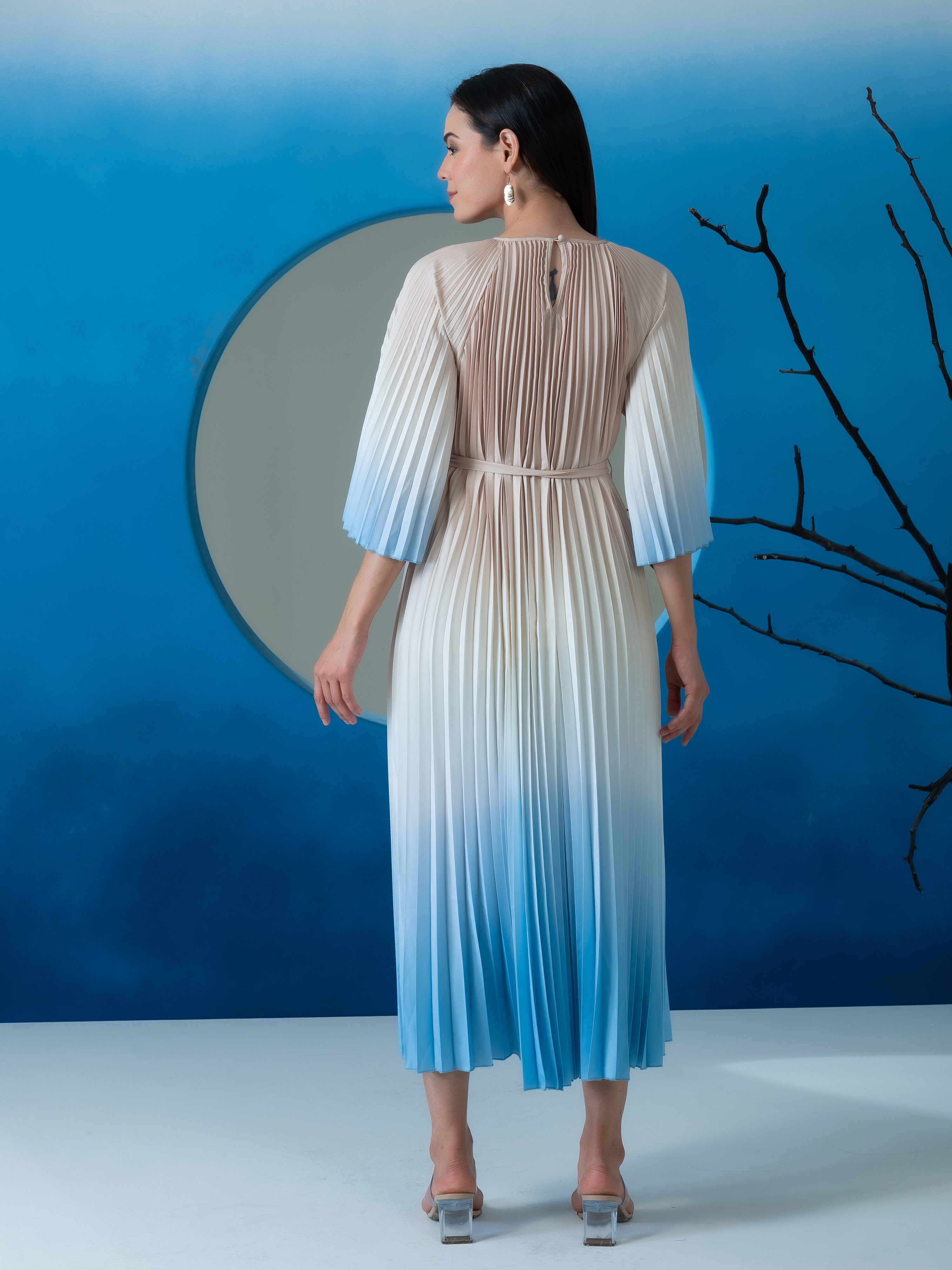 The Serenity dress is a vision of harmonious design, featuring a beautiful ombre effect that transitions from a darker hue at the bodice to a lighter, airier shade at the hem. The bodice is adorned with fine pleating that gives way to a wider pleated skirt, creating a delightful contrast in textures and a flowing silhouette that moves with an ethereal grace.