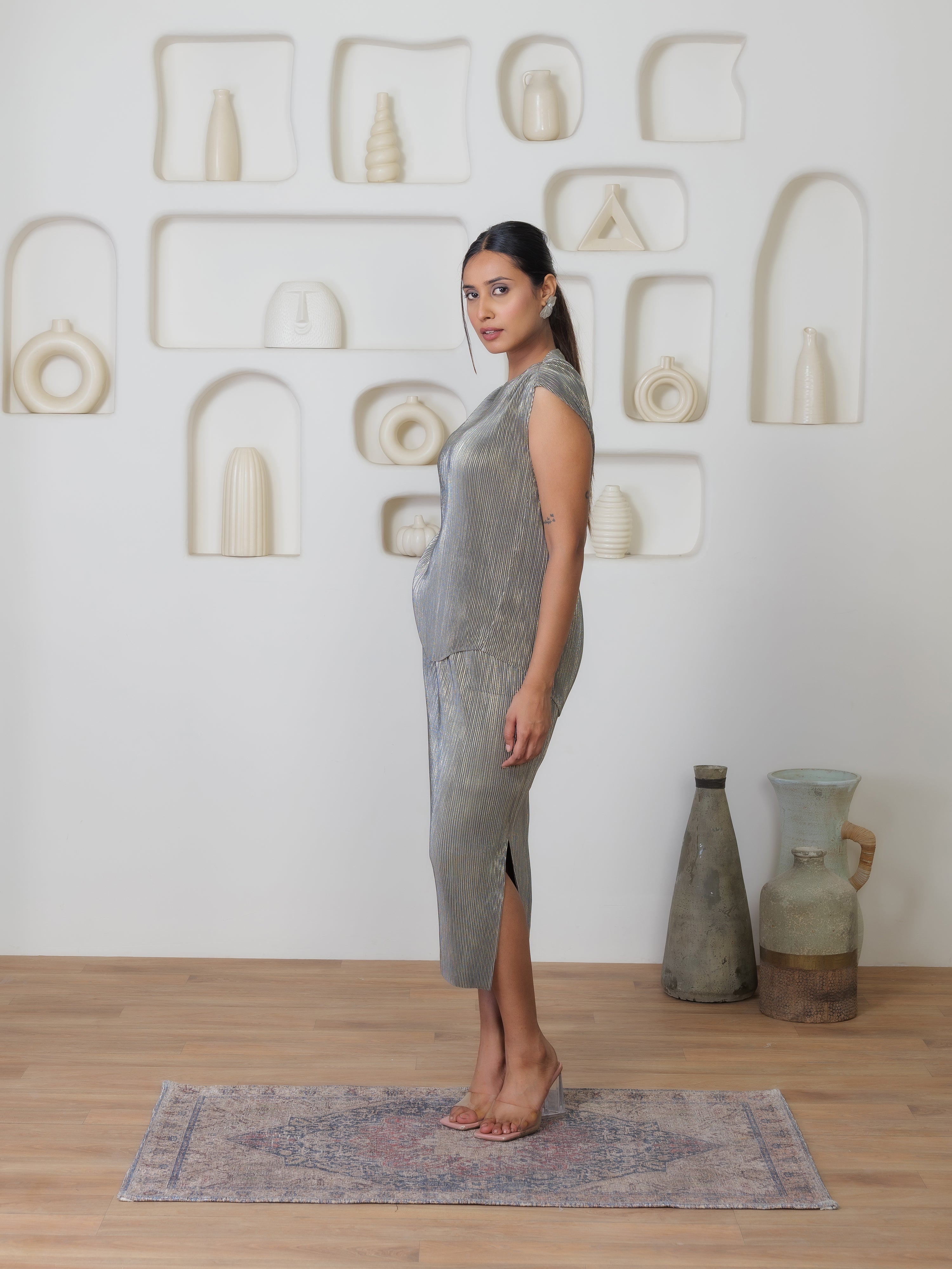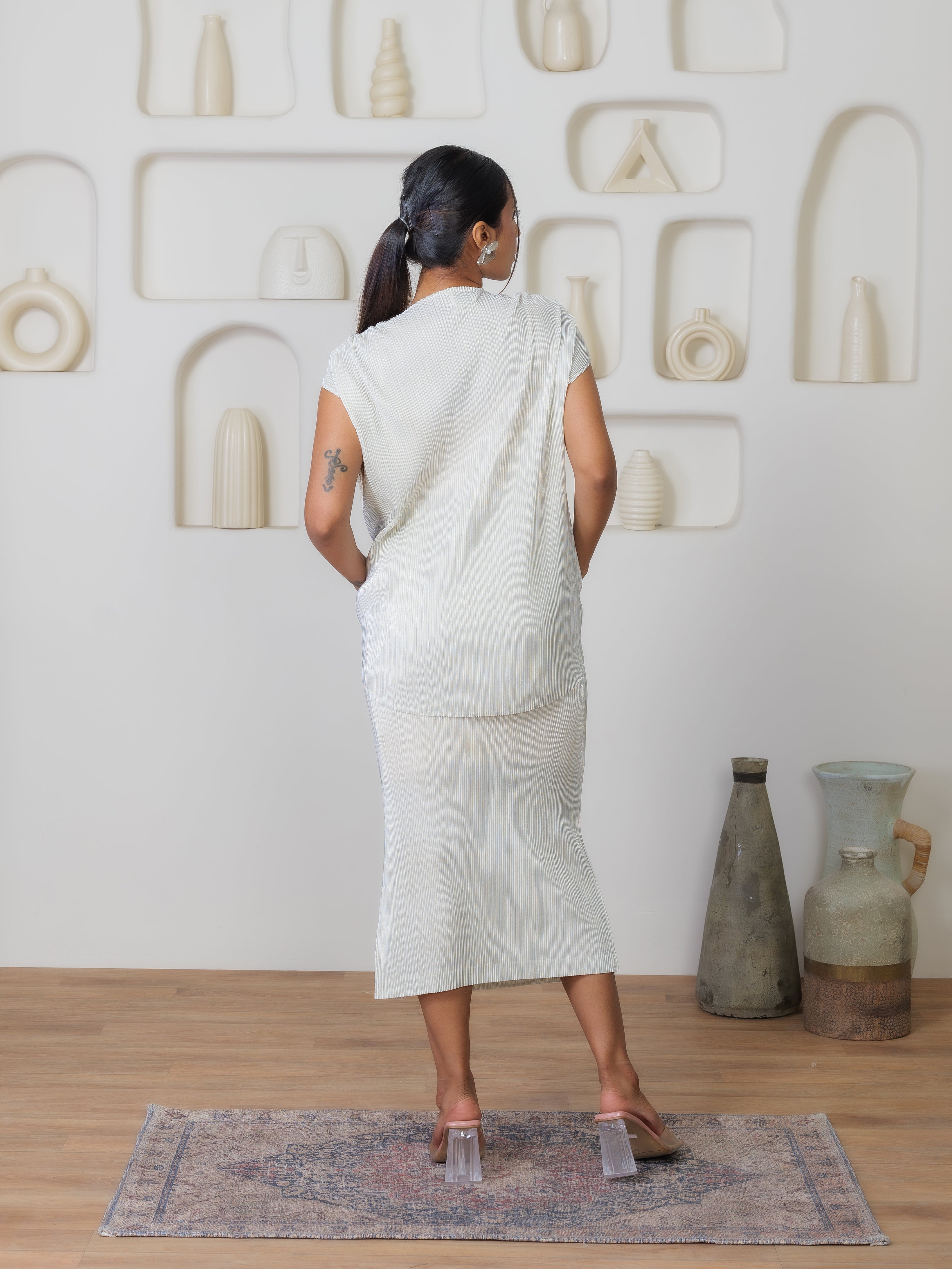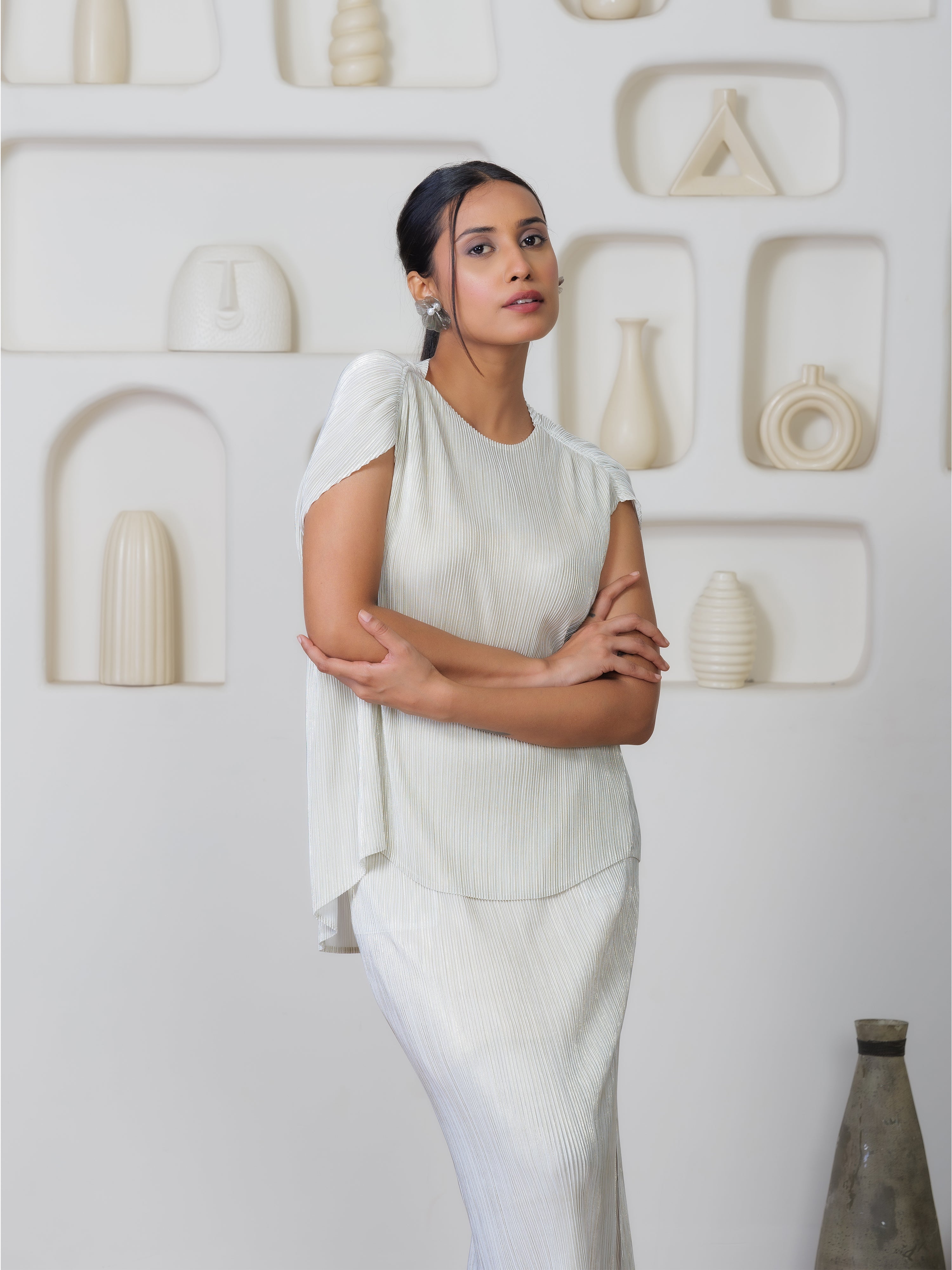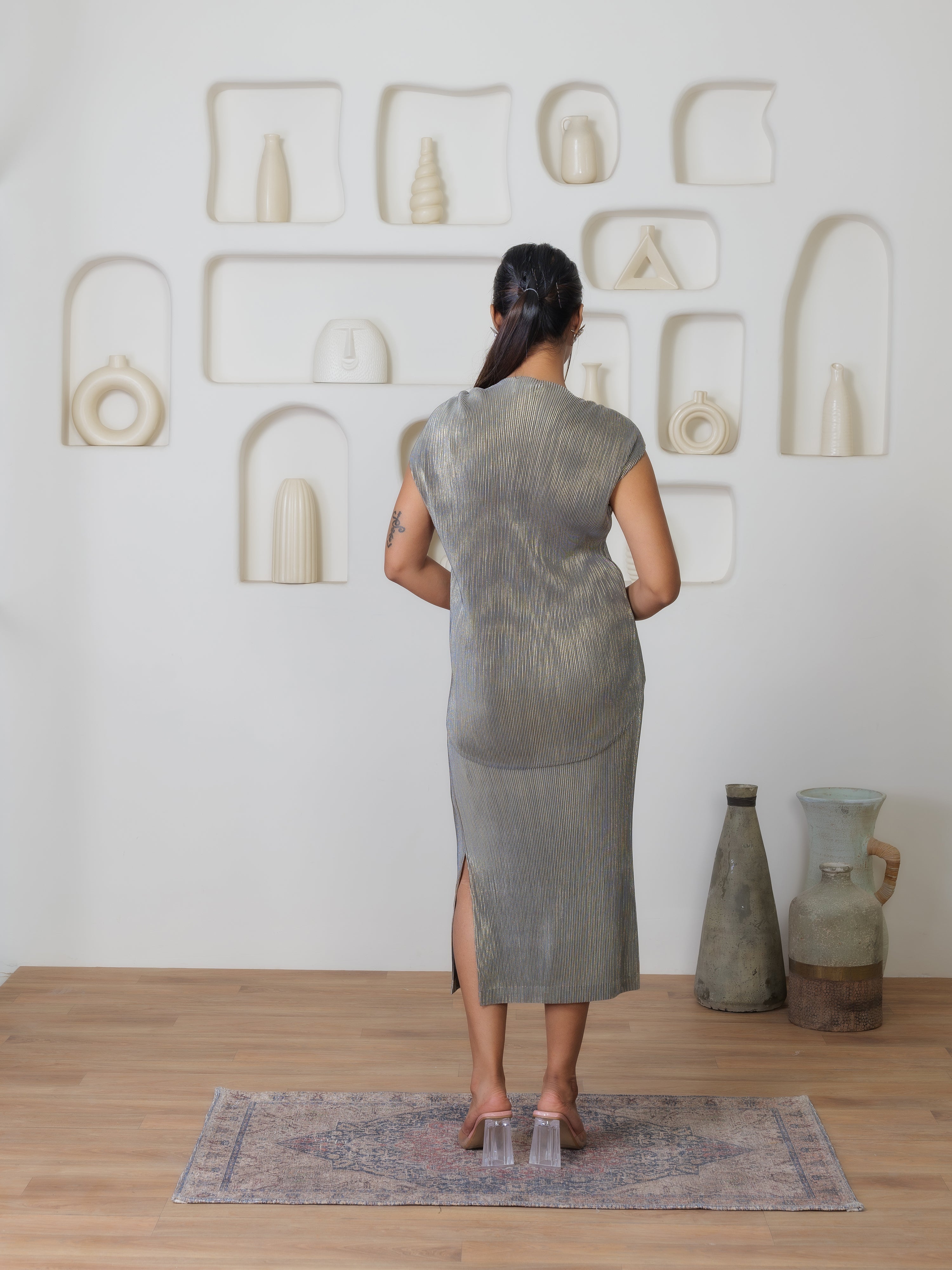 The Sheen Set features a fluid mid-length skirt that gracefully envelops your figure, falling to a flattering point just below the knee. The pleated design adds a dynamic texture that plays with light and shadow, ensuring that you will glisten with every step you take.