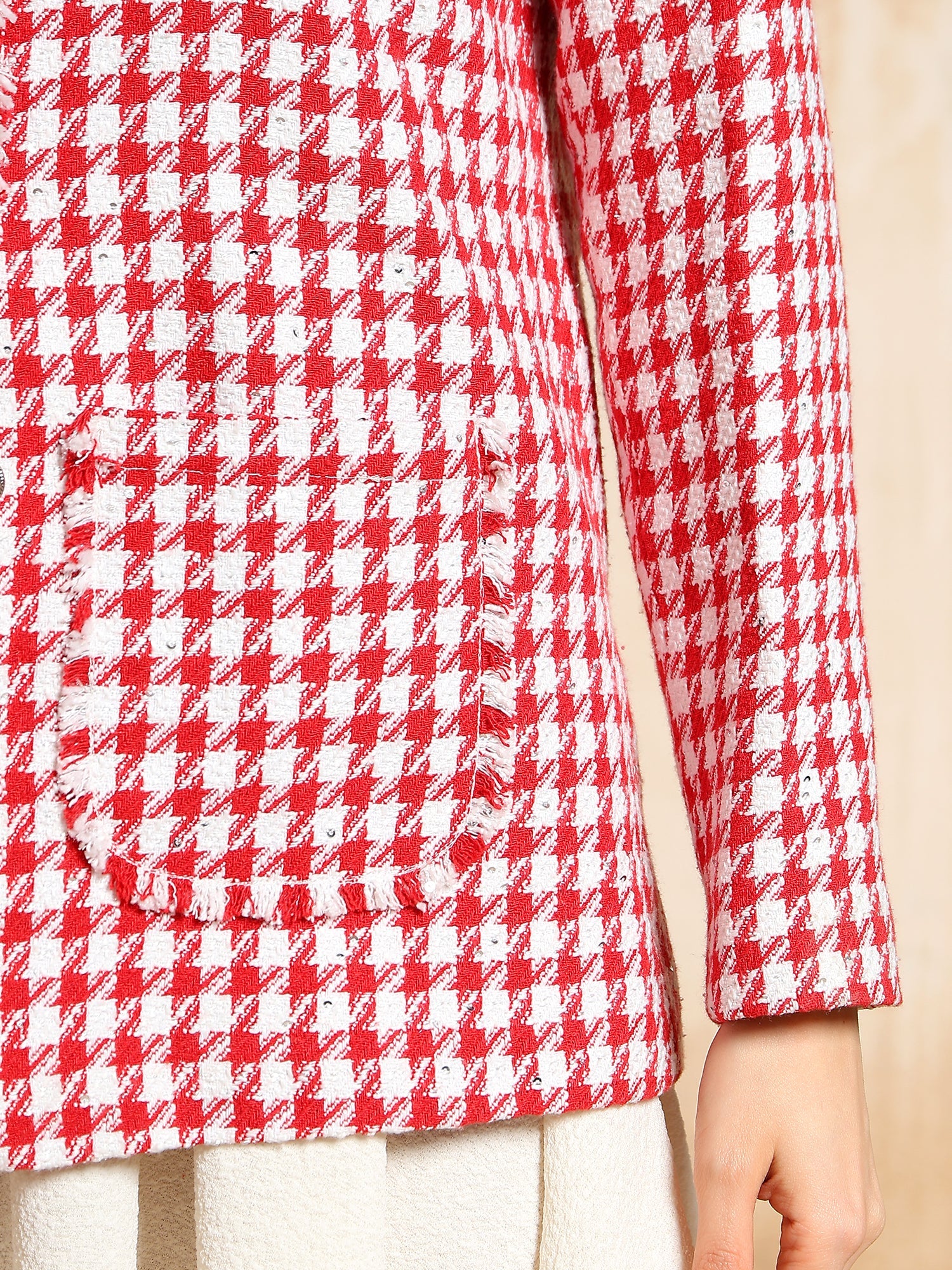 A statement in structure and style, this tailored houndstooth jacket stands out with its green-and-red pattern and refined button detailing. Designed for the woman who owns her presence, the jacket blends classic pattern play with modern power dressing.