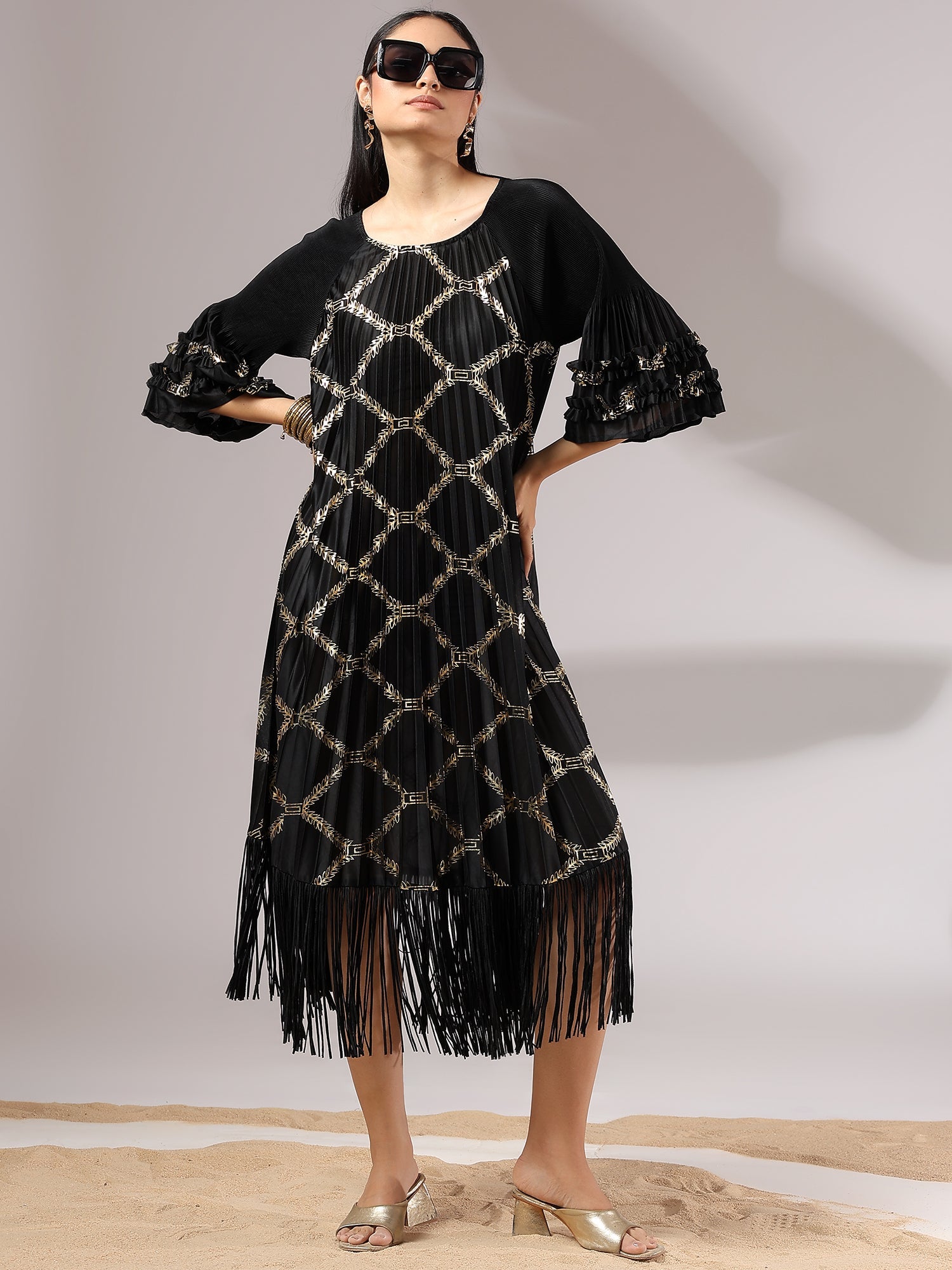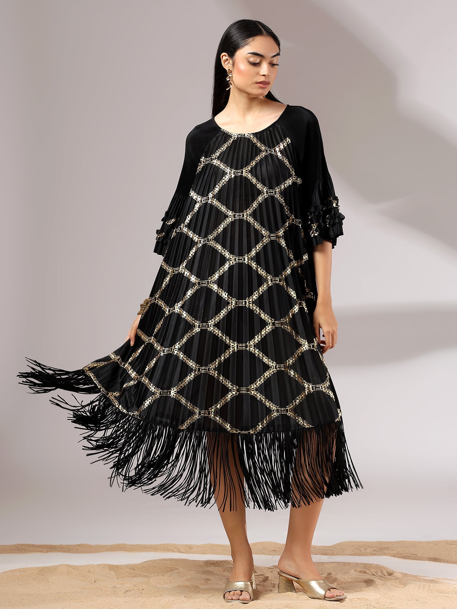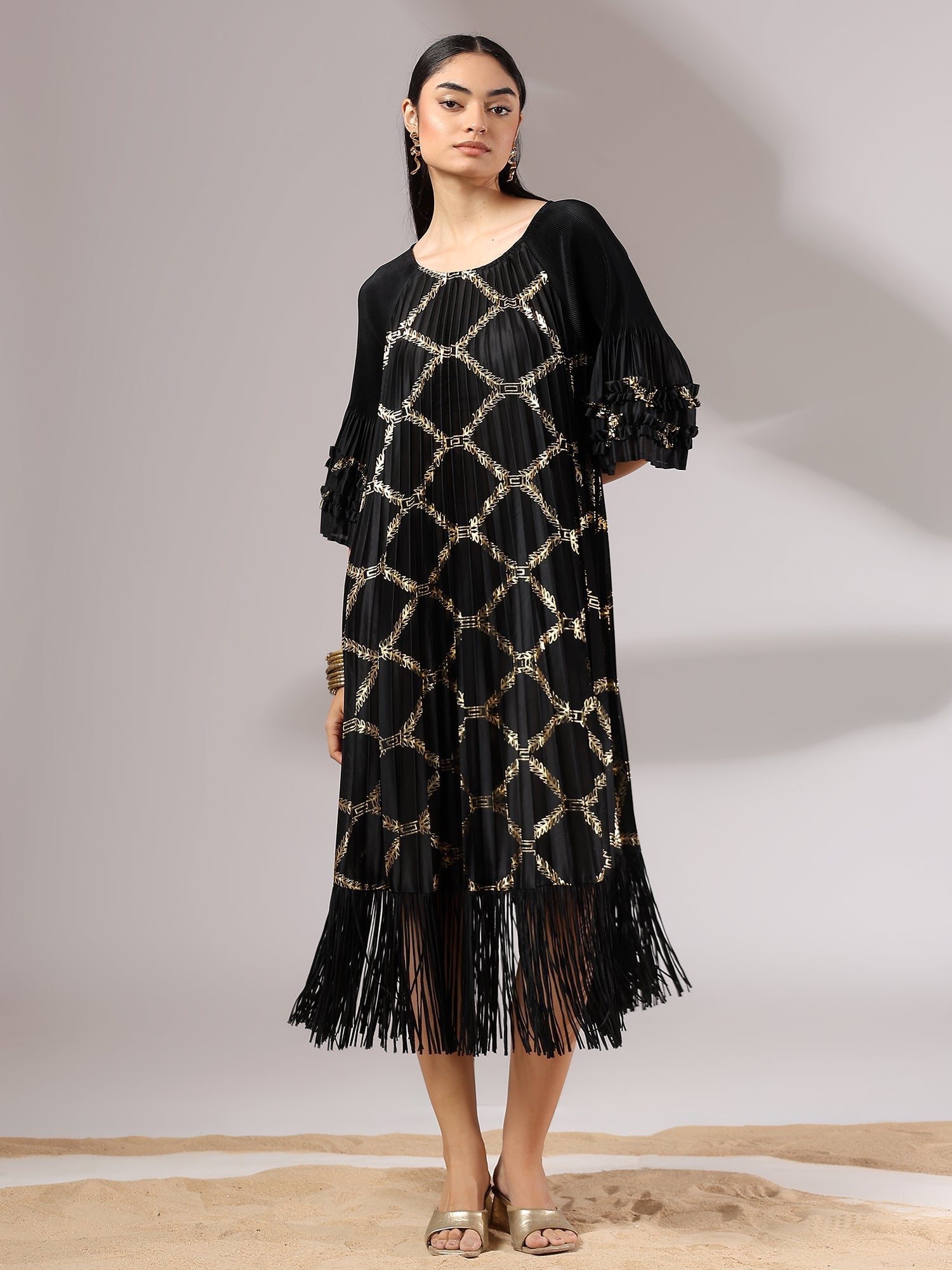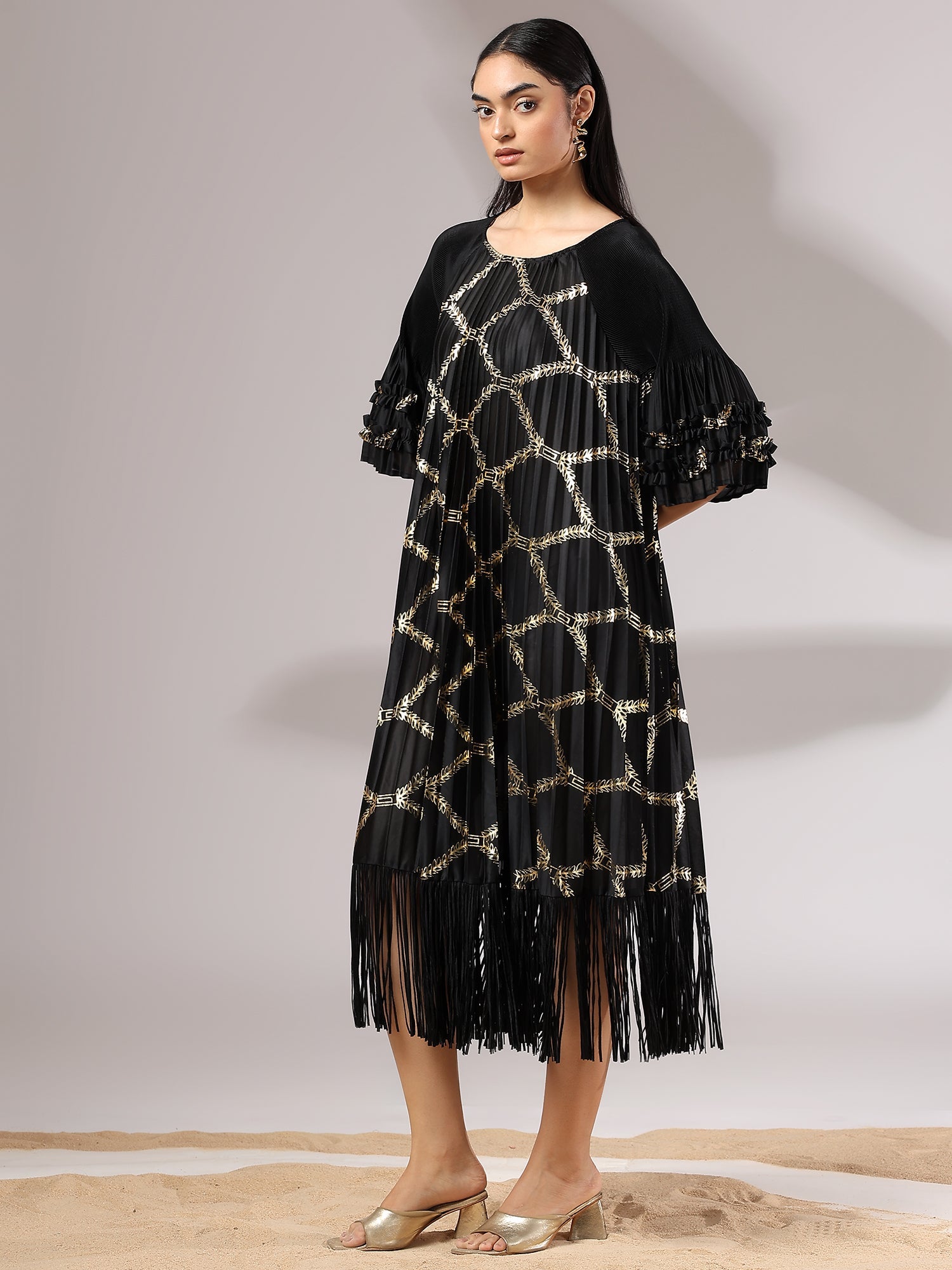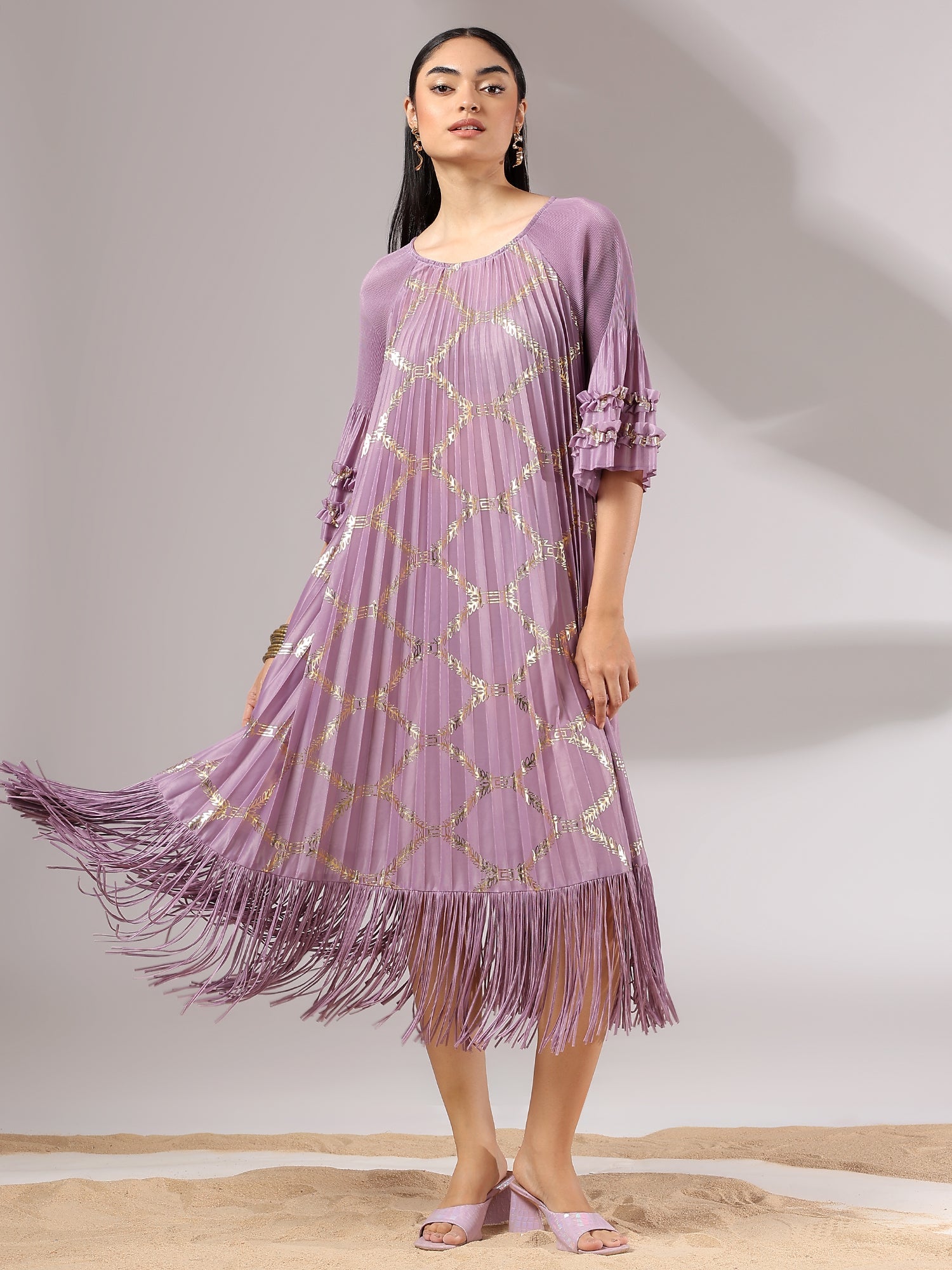 Zaria is a celebration of modern elegance and playful charm. This lilac pleated dress features delicate gold foil motifs arranged in geometric grace, while layered ruffle sleeves and fringed hem add a touch of movement and whimsy. Light, flowy, and effortlessly statement-making — it’s made for the woman who shines softly but surely.